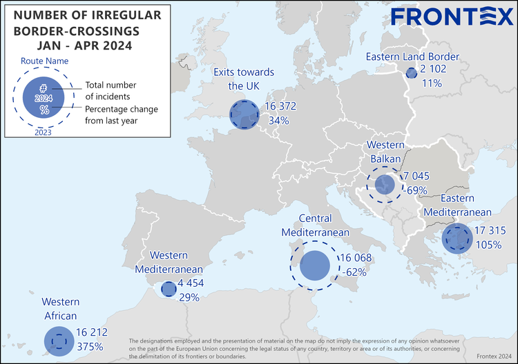Ausgehend von diesen Zahlen scheint es sinnvoller, auf den Routen nach Deutschland nach dem Grund für den Rückgang der Asylantragszahlen zu suchen. Entsprechend lohnt sich ein Blick auf die aktuellen Frontex-Zahlen irregulärer Grenzübertritte auf den wichtigsten Fluchtrouten nach Europa. Zunächst ein Überblick: Sowohl auf der Westbalkanroute wie auch der zentralen Mittelmeerroute sind die Zahlen der irregulären Grenzübertritte zwischen Januar und April 2024 im Vergleich zum Vorjahr um 60-70% zurückgegangen. Auch dies spricht gegen witterungsbedingt zurückgegangene Antragszahlen. Angestiegen sind hingegen die irregulären Grenzübertritte in der Ägäis und auf der westafrikanischen Route. Während zwischen der Türkei und Griechenland doppelt so viele Grenzübertritte als im Vorjahr verzeichnet wurden, haben sich diese auf der westafrikanischen Route sogar annähernd vervierfacht.
